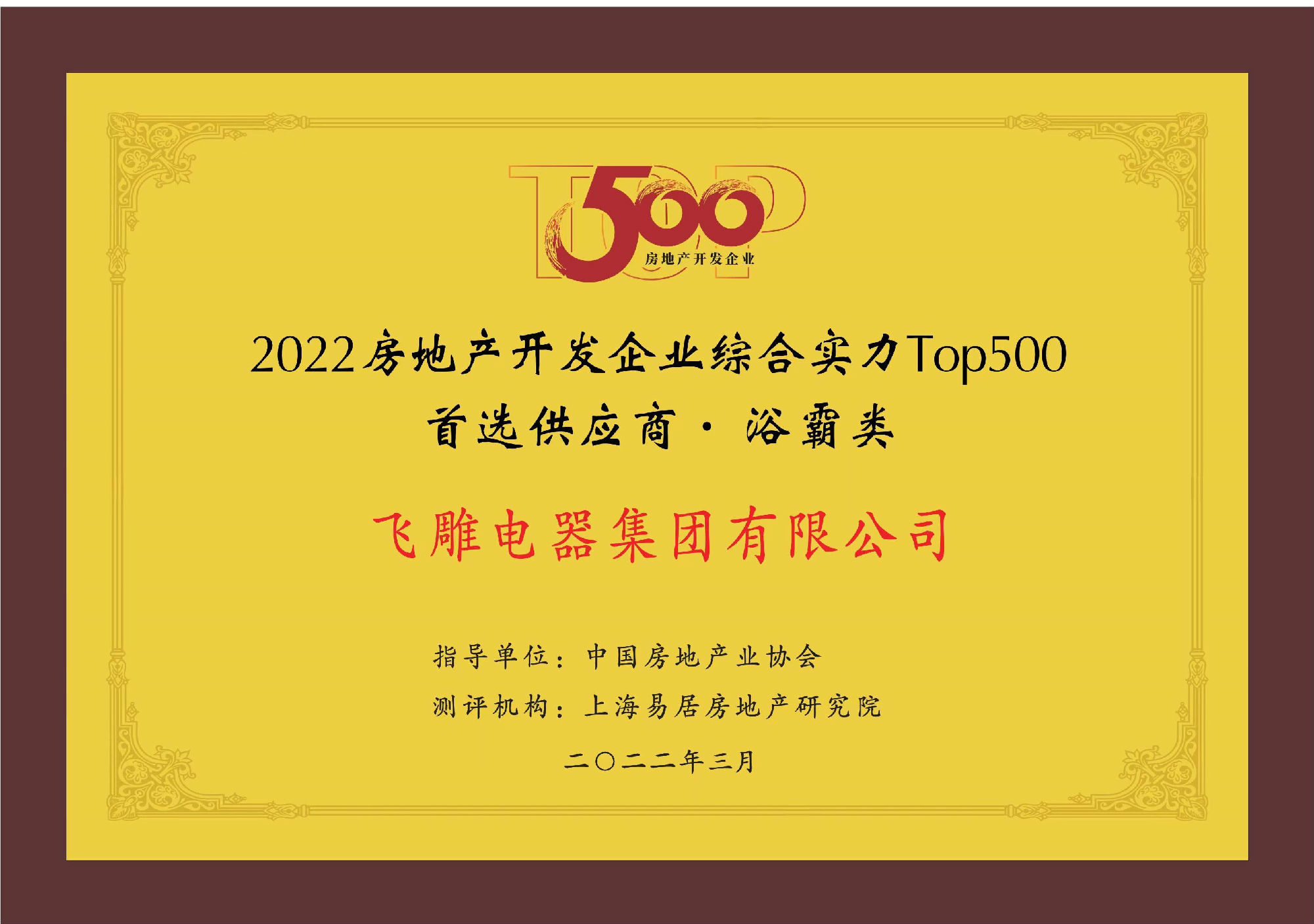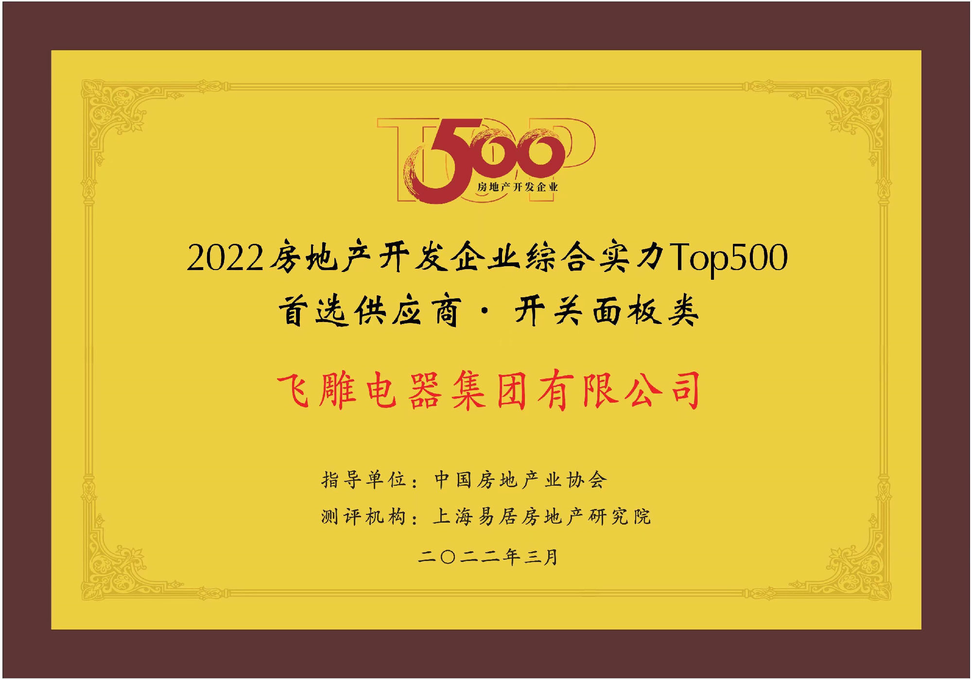 喜報!飛雕電器榮膺2022年房地產(chǎn)開發(fā)綜合實力TOP500首選供應(yīng)商!