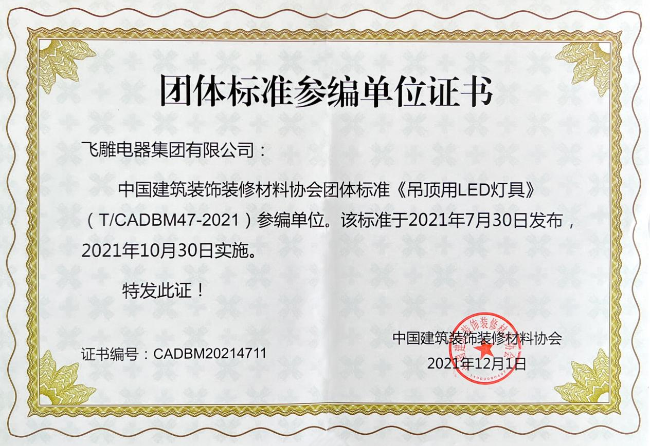 2021年7月30日,由中國(guó)建筑裝飾裝修材料協(xié)會(huì)、吊燈LED燈具照明產(chǎn)業(yè)鏈多家優(yōu)秀生產(chǎn)企業(yè),共同編制的《吊燈用LED燈具》行業(yè)領(lǐng)先的團(tuán)體標(biāo)準(zhǔn)正式發(fā)布。飛雕電器集團(tuán)作為本次團(tuán)體編制單位的一員,堅(jiān)持以行業(yè)標(biāo)準(zhǔn)引領(lǐng)提升,以專業(yè)標(biāo)桿引領(lǐng)LED燈飾照明行業(yè)高標(biāo)準(zhǔn)、可持續(xù)、環(huán)保生態(tài)高質(zhì)量新發(fā)展,獲得了行業(yè)的支持與認(rèn)可,榮獲由中國(guó)建筑裝飾裝修材料協(xié)會(huì)頒發(fā)的團(tuán)體標(biāo)準(zhǔn)參編單位榮譽(yù)證書!